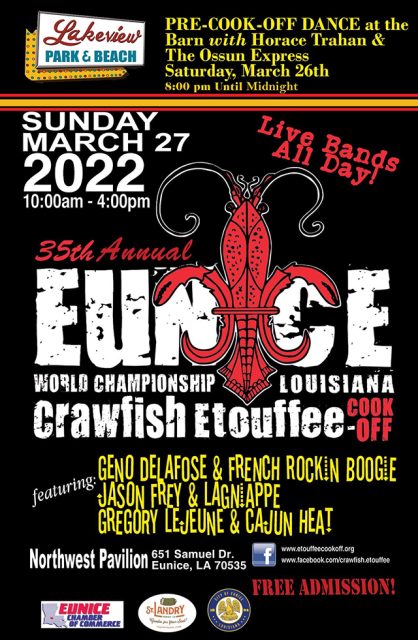 Events & ActivitiesCultureCommunity World Championship Crawfish Etouffee Cook-off set for Sunday in Eunice. CAROLA LILLIE HARTLEYContributing Writer Eunice’s World Championship Crawfish Etouffee Cook-off Contest is set for Sunday,…Carola HartleyMarch 23, 2022