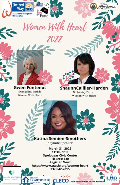 Events & ActivitiesCommunity Women With Heart – Press Release The Women United of St. Landry-Evangeline United Way will host the 10th Annual Women With…Carola HartleyMarch 16, 2022