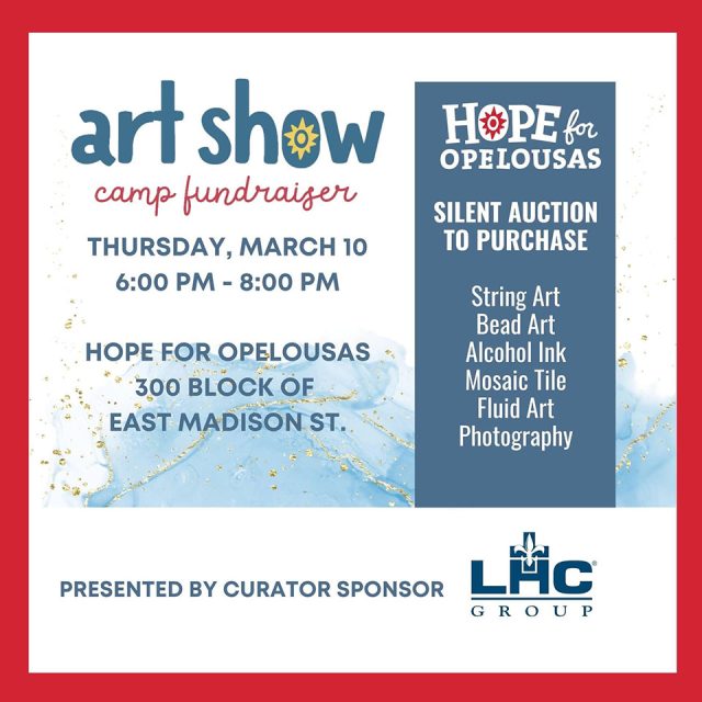 Events & ActivitiesCommunity Hope for Opelousas Art Show – March 10th Hope for Opelousas is hosting an art show camp fundraiser tomorrow, Thursday, March 10, 2022…Carola HartleyMarch 9, 2022