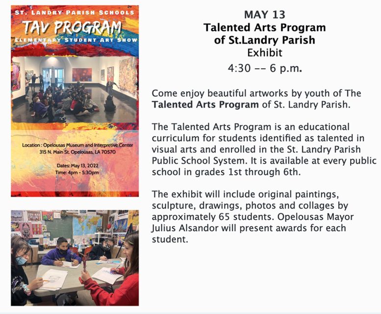 Events & ActivitiesCommunity Opelousas Museum presents Talented Arts Program Exhibit The Opelousas Museum presents Talented Arts Program of St. Landry Parish ExhibitAdminMay 11, 2022