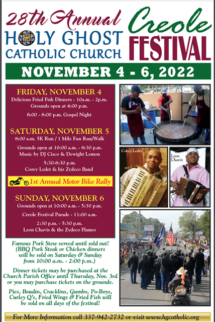 CultureCommunityEvents & Activities 24th Annual Creole Festival Set To Open Tomorrow Mark your calendar for the 24th Annual Creole Festival in Opelousas November 4-6, 2022.AdminNovember 3, 2022