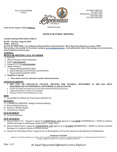 Please see the agenda for the meeting of the Opelousas Board of Aldermen set for Tuesday, August 8, 2023 at 5PM at the City of Opelousas Municipal Plaza Council Chambers.