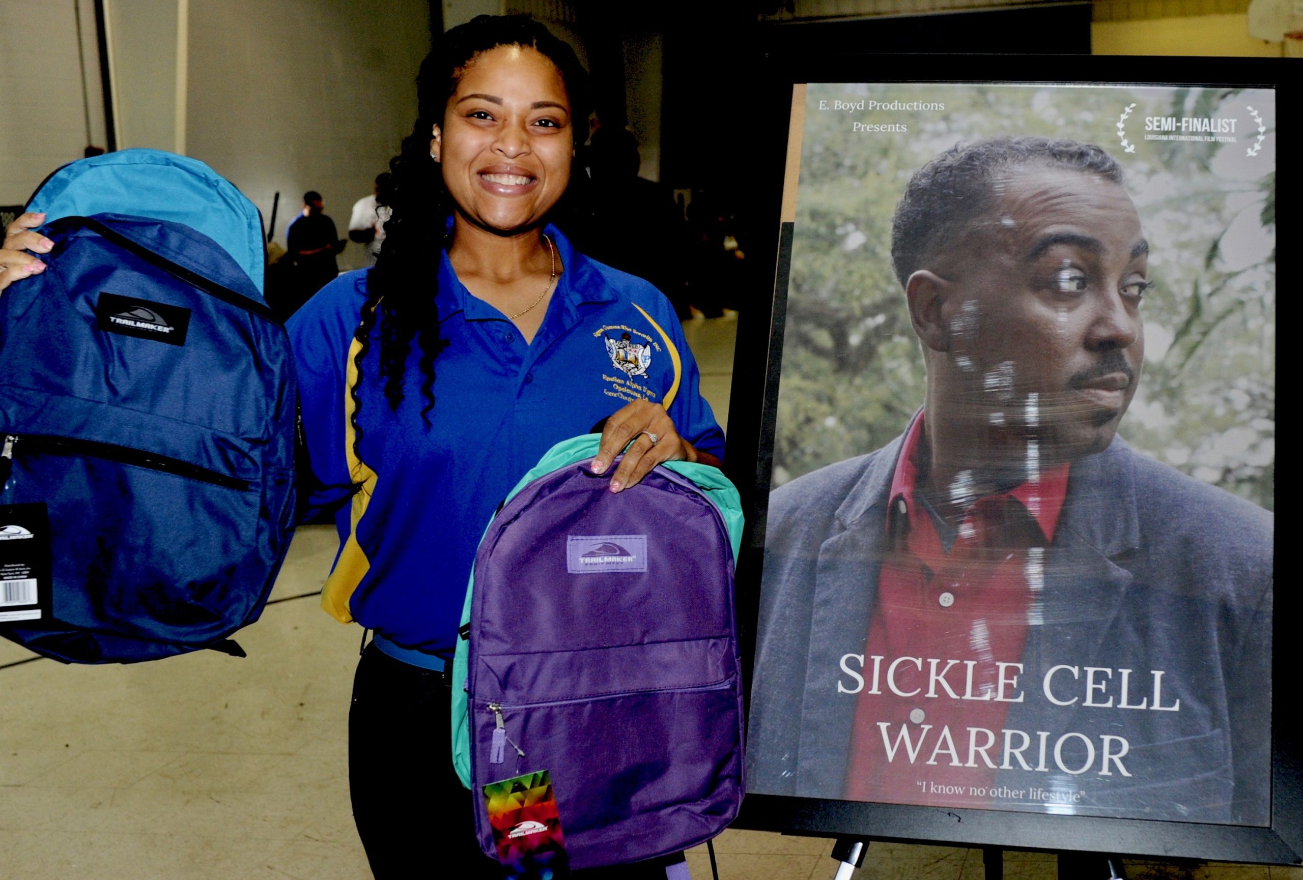 Sigma Gamma Rho Sorority member, Chasity Malveaux, holds up two of the hundred of back packs given away at the 10th annual back to school supply drive headlined by Marvin Richard with assistance by Sigma Gamma Rho Sorority, Lance Chambers and a host of volunteers. This year’s event held at the Opelousas Boys and Girls Club also included a talent show was dedicated to the memory of Sickle Cell Warrior Don Vallien.