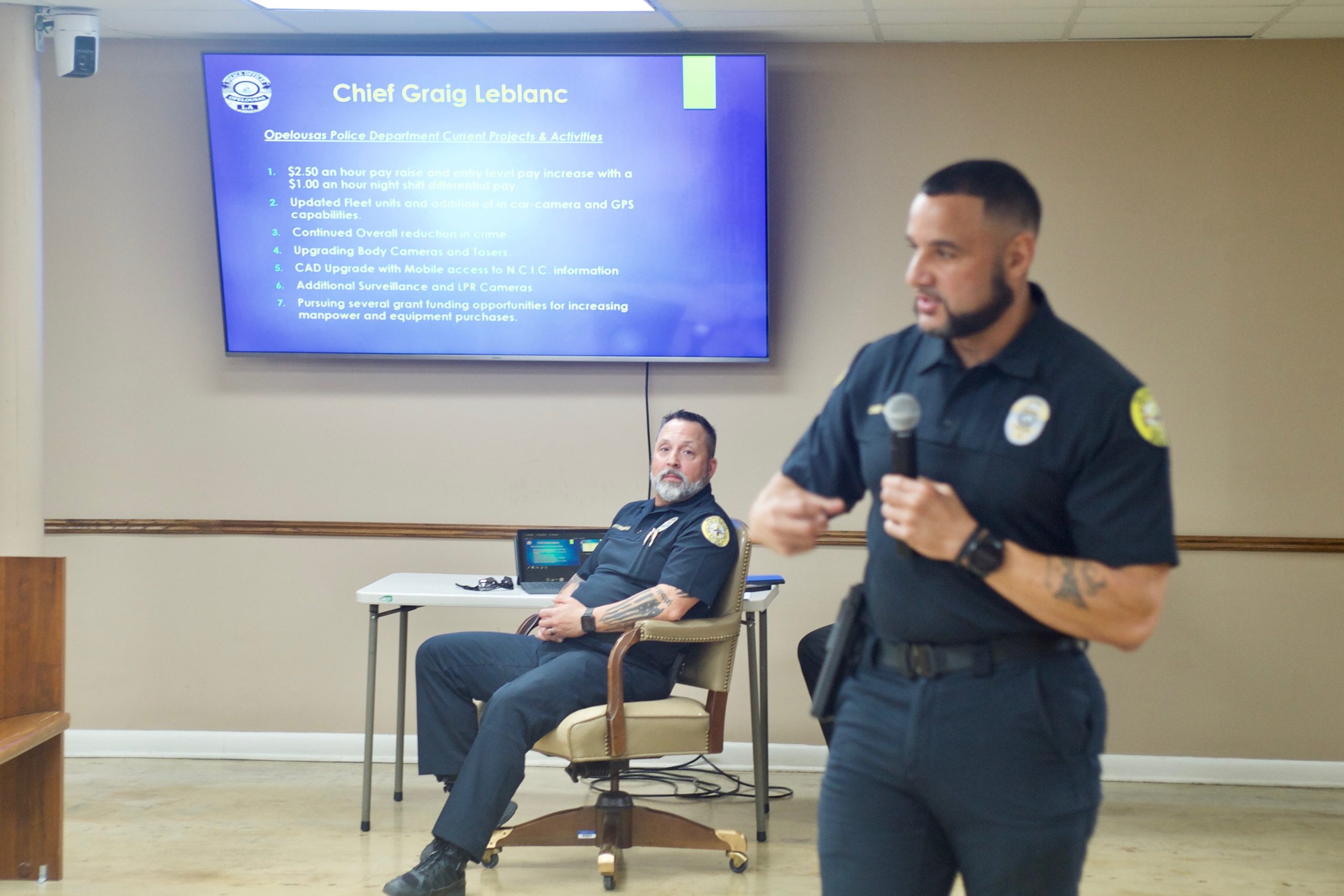 Opelousas Police Chief Graig LeBlanc faced a large crowd of city residents Tuesday night, as he answered their questions and explained annual departmental budget issues, officers’ protocols and the apparent municipal crime reduction that he says has occurred since he took office in 2023.