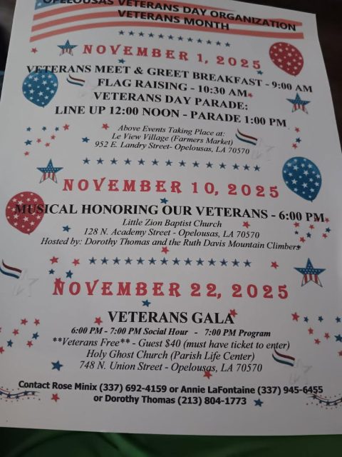 Mark your calendar for the annual Veterans Day celebration beginning on November 1st with a meet and greet breakfast followed by a flag raising ceremony and a Veterans Day parade. All of the above events take place at Le Vieux Village (Farmers Market) beginning at 9 am