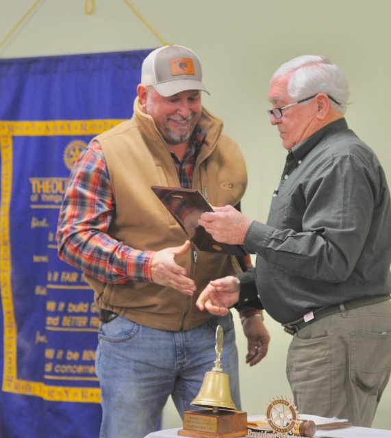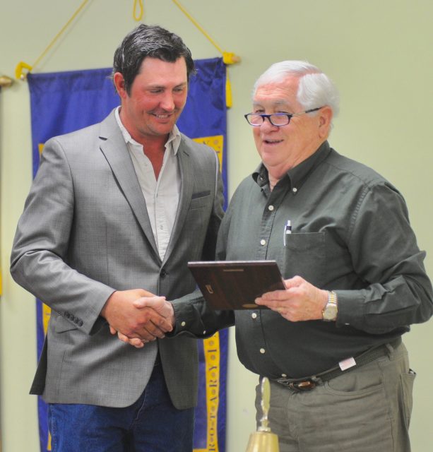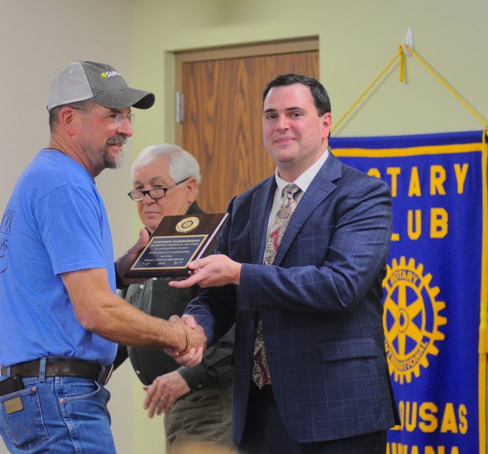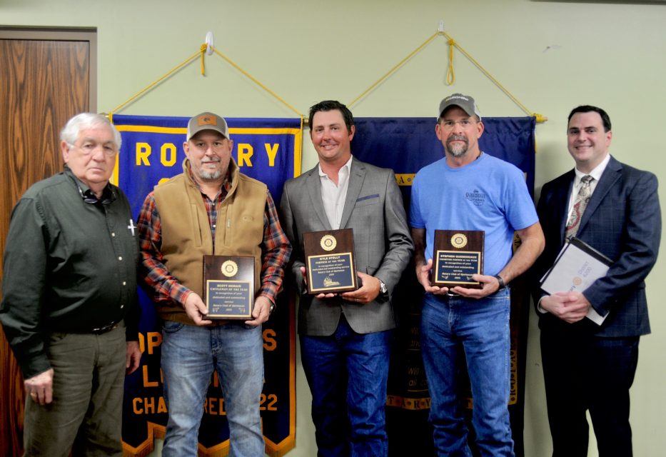 Cattle farmer Scott Morain, crawfish farmer Stephen Quebedeaux and Kyle Stelly, who farms over 1,000 acres of crop varieties, were presented with plaques during the weekly meeting by club members Andy Chautin and Mike Ortego.
