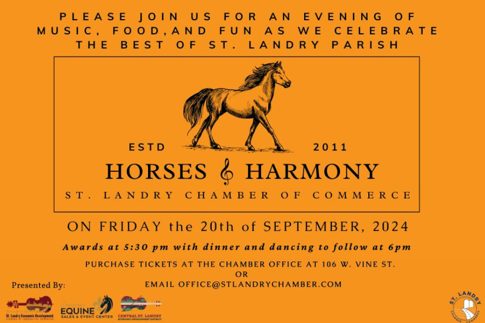 The rhythms of business, music, and rural life come together seamlessly in St. Landry Parish. For that reason, the St. Landry Chamber of Commerce plans to honor the outstanding individuals in business, music, and the equine fields this year with Horses & Harmony: An Evening Celebrating Excellence in Business, presented by St. Landry Parish Government on September 20, 2024.