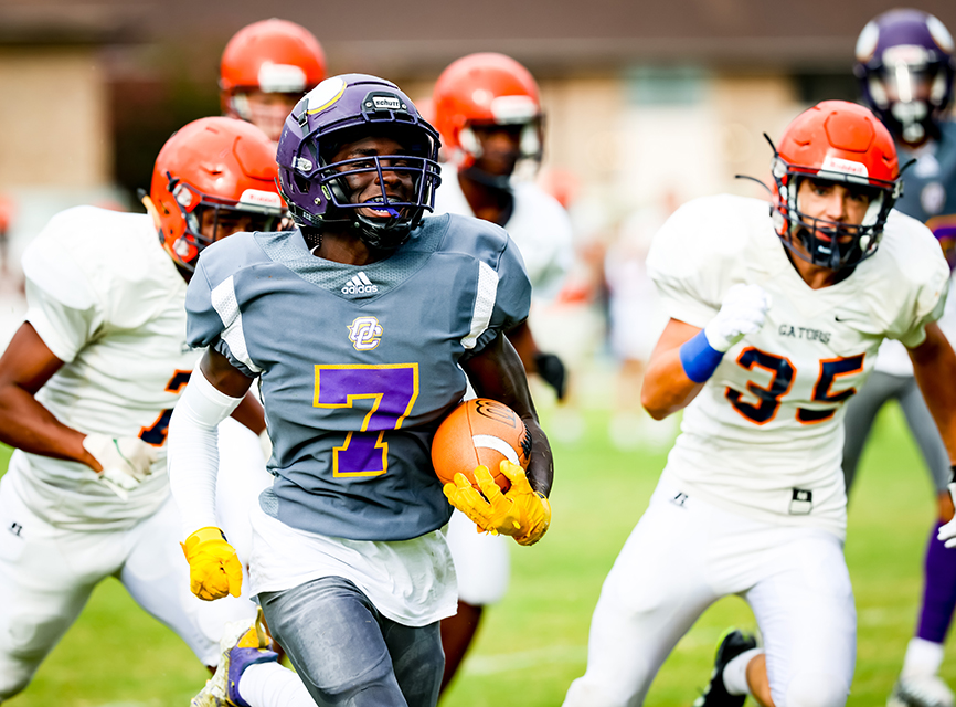 Photograph: OC RB Chris Brown breaks into the open field for a gainer against Beau Chene High School. (Photograph by Mike Curley.)