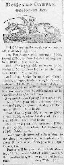 Right: 1860 advertisement in the Opelousas Courier for a horse race on the track owned by Martin Andrepont.