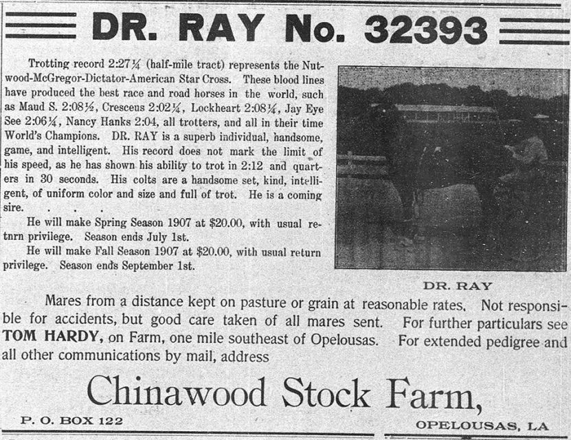 By the turn of the twentieth century there were no more racetracks in Opelousas, but there were still several horse breeders in the area. The breeders proposed a new first class horse track and fair grounds was needed in the town. After several years, the Chinawood Stock Farm, located one and one-fourth miles Southeast of Opelousas, opened in 1907 and operated until about 1909. (It is interesting to note this racetrack was located on land in the area where the present Evangeline Downs is in Opelousas.) Chinawood, owned by Dr. Charles F. Boagni, was known across the US as the home of some of the best-bred stock of horses. Many horses from that farm were sold to owners in other states, with several going to Oklahoma. Chinawood also had a fine horse track for racing. Another leading horse breeder of that time was Major J. J. Thompson on his plantation and farm just outside of town. Besides having his own horse farm, Thompson, who was related by marriage to Dr. Boagni, was associated with him in the horse breeding business, serving as president of the Chinawood Breeders Association.