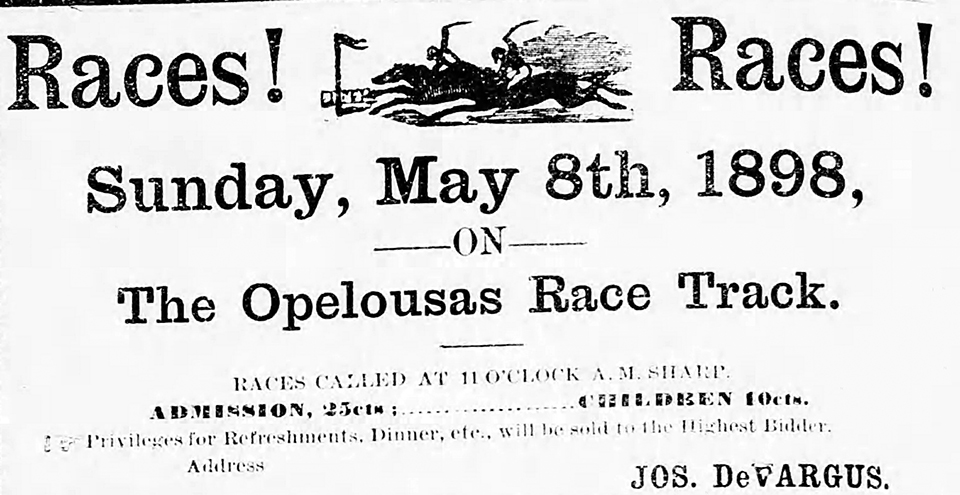 Horse racing is known to be the oldest spectator sport in the United States, and it was a favorite sport in the Antebellum South. That was the case in St. Landry Parish were the Bellevue Course in Opelousas was in operation during the 1820-1830s. In the 1840s, the St. Landry Jockey Club Course, with William Reed as Secretary, held races several times each year. In 1853 there was a 20-mile race in St. Landry Parish between a horse owned by William Henry Parrott and a stranger’s horse. As reported in the January 15, 1853, Opelousas Courier, Parrott’s horse won the race and the $150.00. In 1860, Martin Andrepont had a racetrack located on his land seven miles northwest of Opelousas.