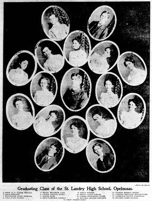 The following evening, Friday June 21, the graduation exercises of St. Landry High School was held at the school building. The program presented included the history of high school, delivered by Miss Lucille Bloch, with other addresses by school board members, public officials and school personnel. The main address, an essay on “True Womanhood,”  was presented by the honored graduate Belle Dupre, who received a standing ovation for her delivery. As the newspaper account stated, “at the end of the evening students, teachers and parents were all congratulated and elated.”