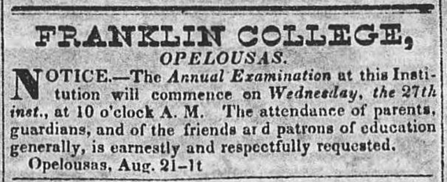 Notice of Annual Examination at Franklin College in Opelousas publisher in the St. Landry Whig in 1845.