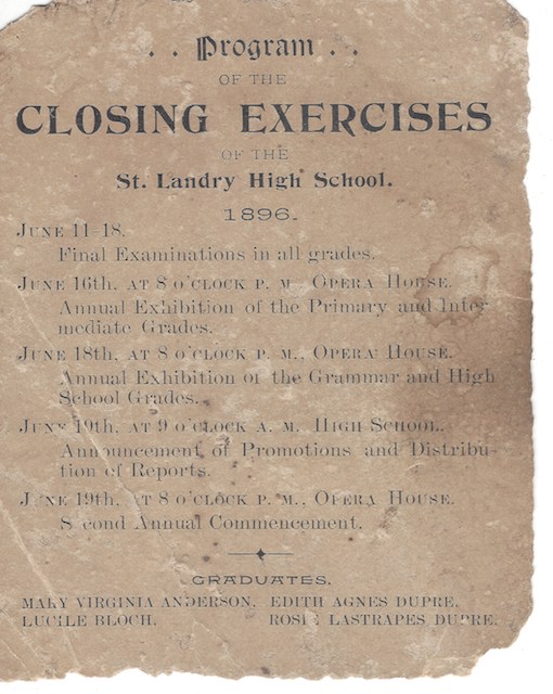 The first St. Landry High School graduation class consisted of only one student, Miss Belle Dupre. Newspaper accounts of the first commencement held in June of 1895 stated it was very successful with a large crowd in attendance. The first part of the commencement ceremonies began with entertainment for the primary and intermediate department of the school on Thursday evening, June 20, 1895 at the Sandoz Opera House in Opelousas. A large crowd gathered to see and hear the school children preform music, song and pantomime drama.
